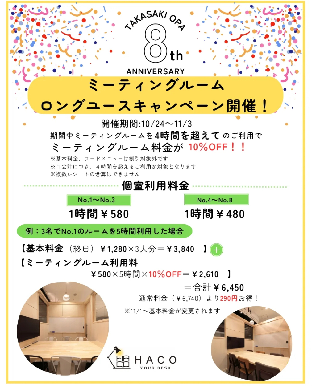 ⏰ 4時間を超えるご利用でミーティングルーム料金が10%OFF! ✨